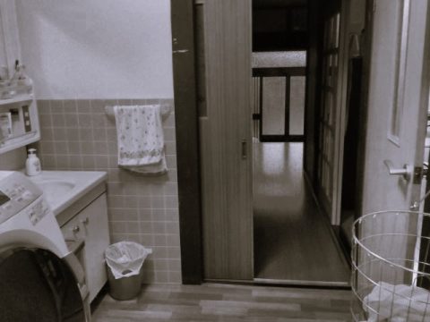 Before昔ながらの洗面脱衣室。風を通すのに、戸を開けたままにしていると玄関から丸見えなのが困ったところ。 収納も足りないので、いつもごちゃごちゃしている感じがします。